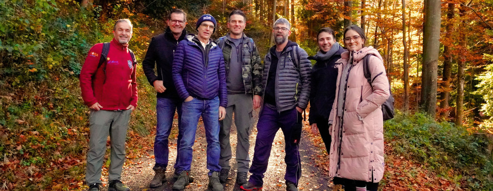 Oben angekommen, ging es los mit einer ausgedehnten Wanderung durch das herbstlich gefärbte Waldgebiet. Andreas führte uns nicht nur durch die Natur, sondern auch durch Themen wie Biodiversität, Bodenschutz, Aufforstung und Klimafolgen, spannend, konkret und mit erstaunlich vielen Parallelen zur Finanzwelt.